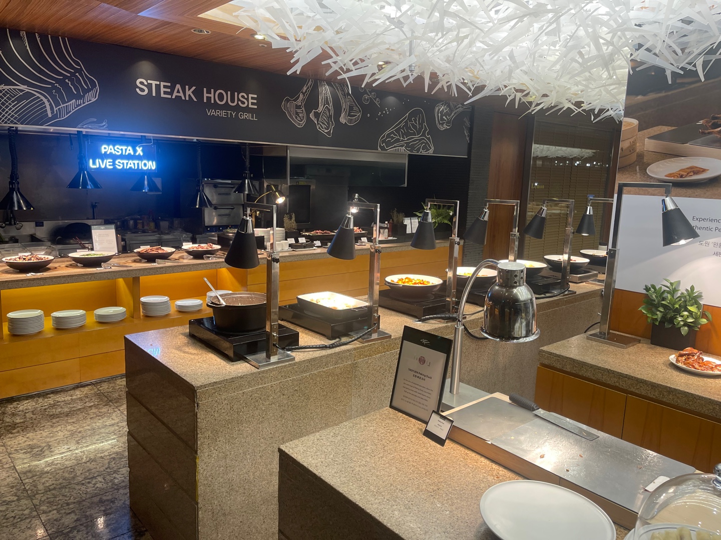 - 즉석에서 요리해주는 라이브 스테이션은 스테이크와 파스타 등 고객의 취향에 맞춘 메뉴를 제공합니다.